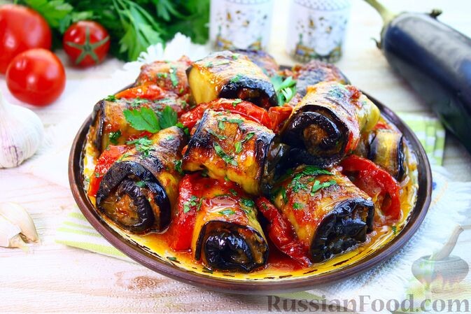 - Баклажаны с фаршем в томатном соусе: Нежные рулетики, фаршированные мясным фаршем, запеченные в насыщенном томатном соусе, станут настоящим угощением для любого стола.