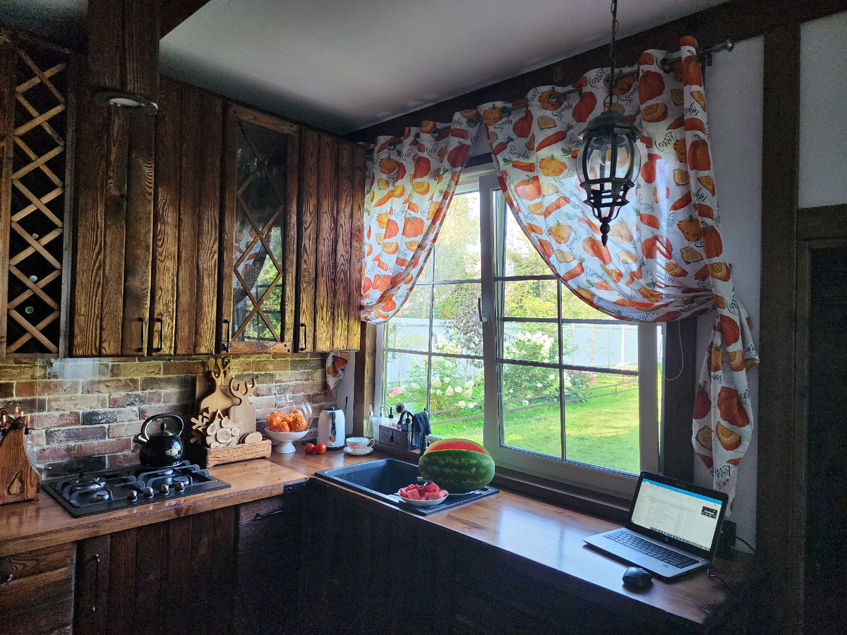 Кроме штор, из остатков ткани были созданы 12 подушек, где одна сторона — тыквы, а другая — оранжевая бязь. Все это наполнило пространство теплом и уютом.