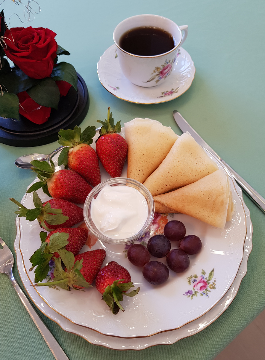 Обжарьте блины с обеих сторон до золотистой корочки. Готовые блины разложите по тарелкам и щедро дополните сметаной, свежей клубникой и виноградом. Такой десерт обязательно порадует гостей!