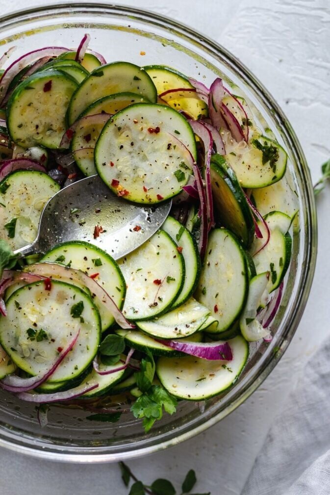 Кабачки – универсальный и полезный овощ, который способен украсить любое блюдо. Простой и легкий в приготовлении салат из маринованных кабачков станет отличным дополнением к какому угодно приему пищи. Сочетание свежести и пикантности, благодаря красному луку и ароматным специям, придаст этому салату уникальный вкус.
