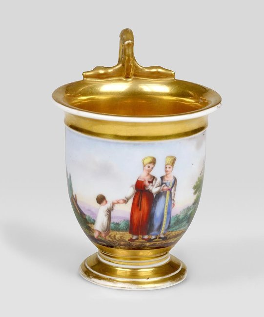 Внимание привлекает фарфоровая чашка, созданная на знаменитом заводе Франца Гарднера в первой четверти XIX века. Декор на чашке, где изображены женщины в традиционных русских сарафанах и кокошниках, отдает дань романтизированным представлениям о крестьянской жизни и чаепитии, становящемуся центральным элементом домашних посиделок.