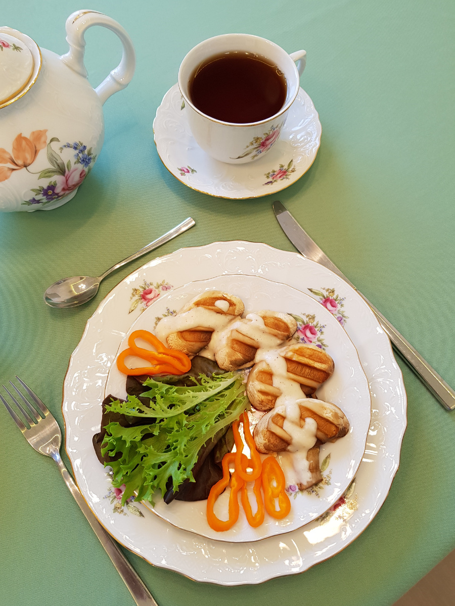 Вот несколько интересных цифр о блюде: на 100 граммов завернутых шампиньонов с соусом содержится 67,6 ккал, 3,6 г белков, 4,8 г жиров и 2,4 г углеводов. Если рассмотреть одну порцию весом 184 грамма, то получится 124,35 ккал, 6,6 г белков, 8,9 г жиров и 4,5 г углеводов.