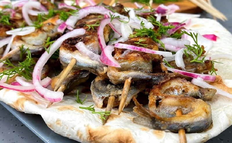 Пока мойва жарится, уложите лаваш на тарелку, выложите сверху рыбные шашлычки и приправьте нарезанным красным луком, предварительно замаринованным в смеси уксуса, воды, соли и сахара.