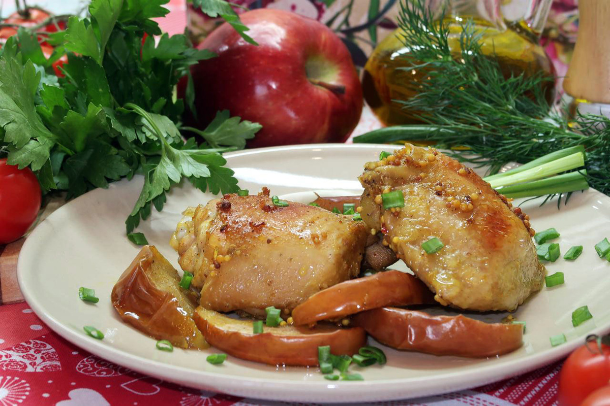 Приготовление: Промойте и обсушите бедрышки. Смешайте соевый соус, масло, горчицу, специи и чеснок. Замаринуйте курицу на 30 минут и положите в жаропрочную форму с дольками яблока. Запекайте при 190°C в течение 45 минут. Готовность проверяется по прозрачному соку, который должен вытекать из мяса.