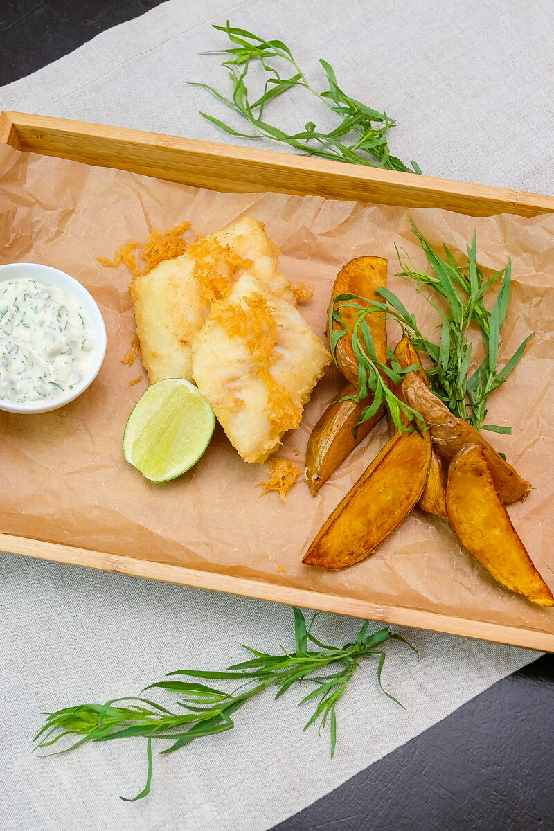 Сначала все ингредиенты для соуса ремулад помещаются в кухонный комбайн, где их нужно тщательно измельчить до однородного состояния, а затем смешать с майонезом.Темпурную муку соединить с ледяной водой и перемешать ручным методом до получения консистенции, напоминающей жидкую сметану. Затем обвалять филе трески в оставшейся муке и погрузить в полученное тесто, дать стечь перед жаркой в раскаленном масле.Очистить картофель, нарезать его дольками и обжарить до золотистого цвета в растительном масле.Подавайте фиш энд чипс в пакете из пекарской бумаги, а соус ремулад отдельно.Приятного аппетита!