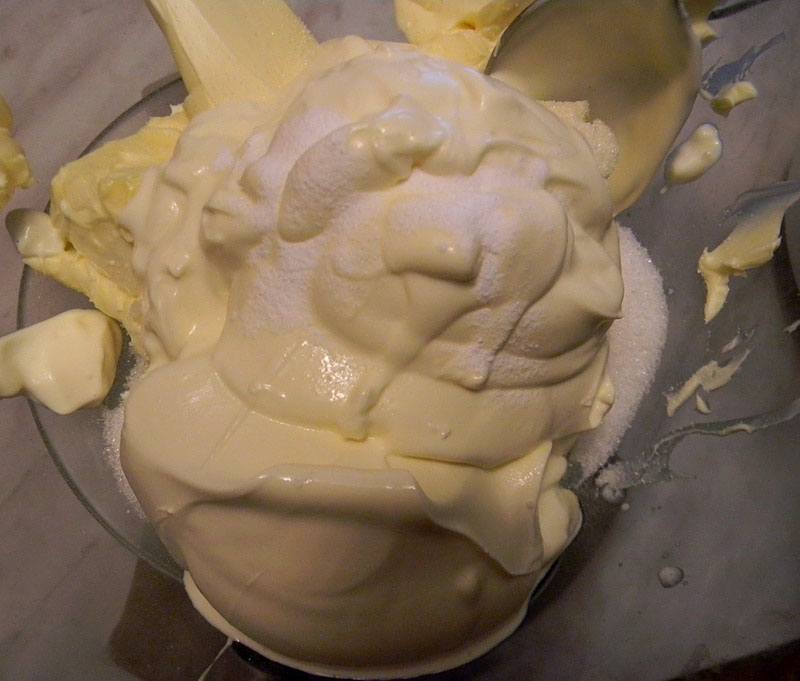 3. Для крема последствия взбейте сметану с сахаром, затем аккуратно смешайте с взбитым маслом и сгущенкой, добавляя по ложке. Крема должен получиться нежного бежевого цвета.