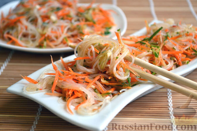 Салат "Фунчоза по-корейски" знакомит нас с азиатским стилем кухни, где стеклянная лапша в сочетании с овощами и специями создаёт настоящую взрывную симфонию вкусов.