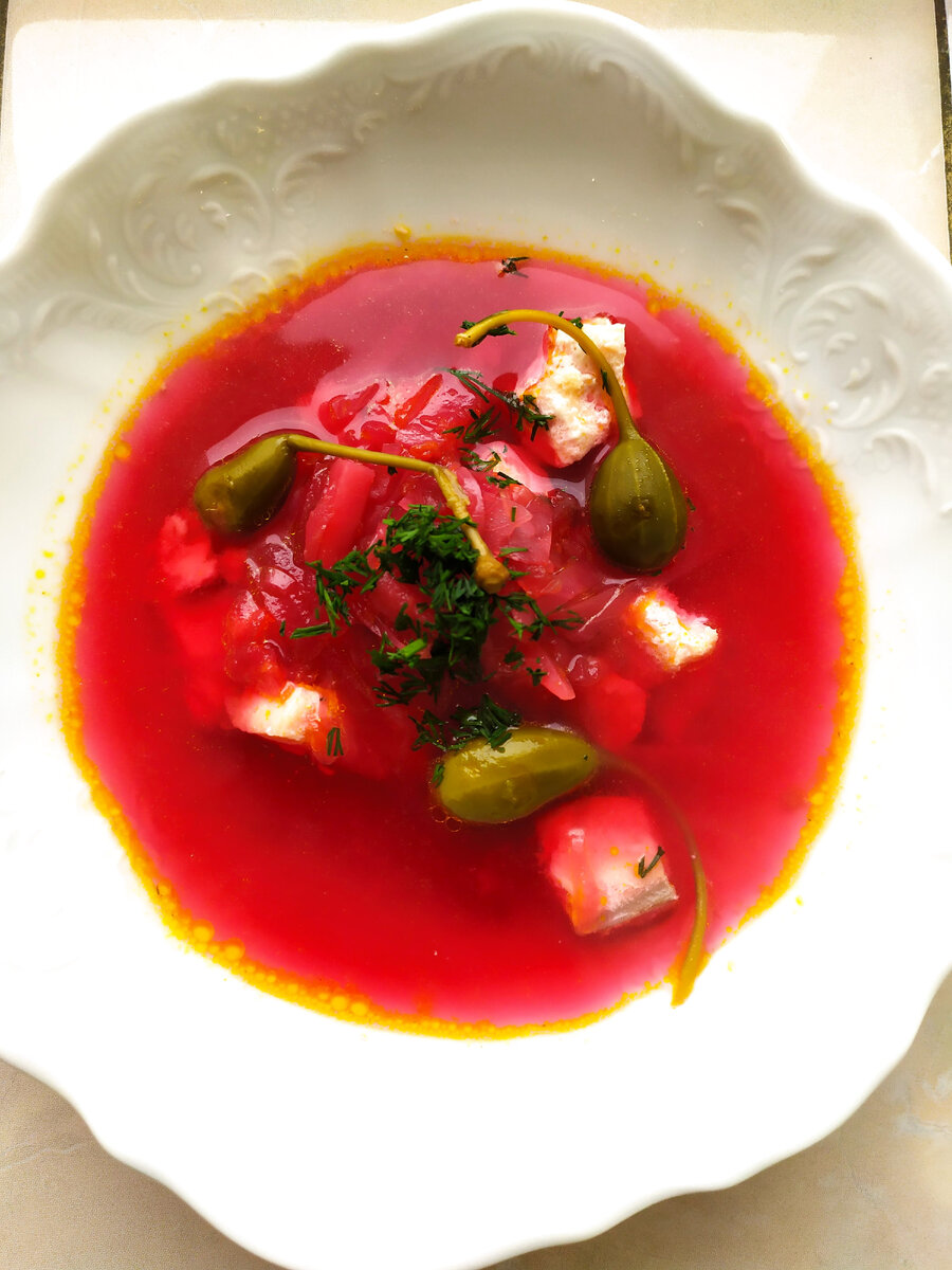 Постный борщ с лососем и каперсами