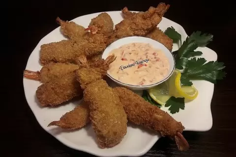 Каждую креветку обмакиваем в кляр, затем обваливаем в панировочных сухарях. Чтобы добиться идеального размера, можно повторить процесс обмкивания два-три раза. Опускаем креветки в кипящее масло, сначала на 1 см, подержите их 5 секунд, а затем полностью. Жарим 3-4 минуты до золотистой корочки.