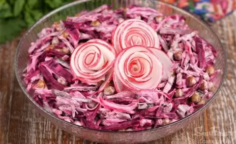 Свёклу нарезают на кусочки, приправляют солью и растительным маслом, а затем запекают в духовке. После этого на листья салата выкладывают запечённые ломтики, сверху присыпают брынзой и поливают оливковым маслом. Этот салат не только вызывает аппетит своим внешним видом, но и радует настоящим взрывом вкусов.