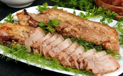 Затем заверните грудинку в пакет для запекания, удалив из него воздух, и оставьте в холодильнике минимум на час. Для более насыщенного вкуса можно оставить на ночь. Разогрейте духовку до 150 °C и запекайте сало в пакете в течение двух часов, однако за полчаса до окончания запекания аккуратно разрежьте пакет, чтобы мясо подрумянилось. После запекания дайте ему полностью остыть для лучшей нарезки.
