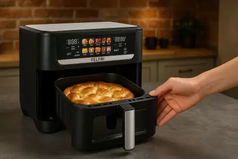 Приготовление: Разогрейте аэрогриль до 175°C в течение 2–3 минут. Смажьте форму для выпечки и выложите половину яблок на дно. В отдельной миске взбейте яйца с сахаром и щепоткой соли до легкой пены, затем добавьте муку с разрыхлителем и при желании — специй. Вылейте тесто на яблоки и распределите оставшиеся дольки сверху. Выпекайте в аэрогриле 12–15 минут. Подождите 5 минут перед извлечением пирога, чтобы он стал более устойчивым.