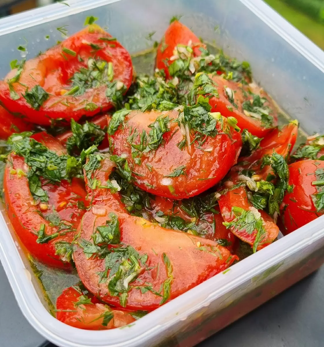 - Ингредиенты: 1 кг помидоров, 3-4 зубчика чеснока, укроп, петрушка, базилик по вкусу, 500 мл воды, 1 ст. л. сахара, 1 ст. л. соли, 2 ст. л. уксуса 9%.