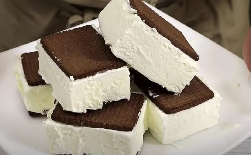 Далее, на дно формы выкладываются печенья, оставляя между ними расстояние в 0,5 см. Печенье должно быть расположено таким образом, чтобы в каждом ломтике мороженого была часть печенья. Можно использовать любые виды печенья: песочное, шоколадное или крекеры, в зависимости от предпочтений.