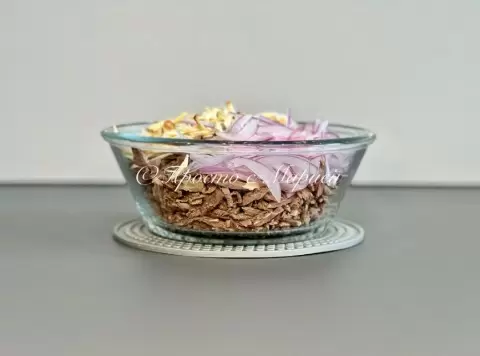 Первым делом нужно подготовить лук, нарезав его тонкими перьями и замариновав в смеси уксуса и воды с добавлением соли и сахара. Маринование займет всего 15 минут, за этот короткий срок лук станет более мягким и ароматным.