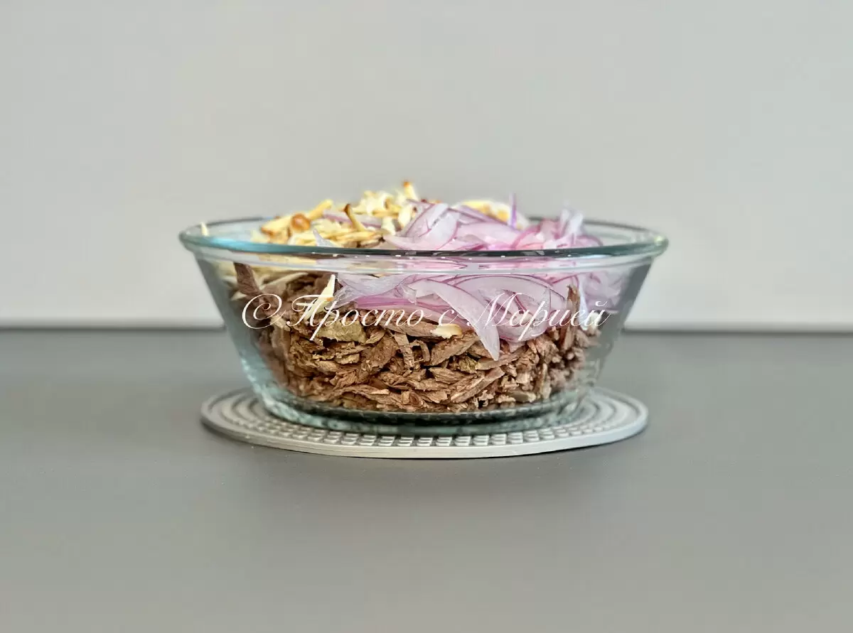 Тем временем можно заняться основным ингредиентом - говядиной. Ее следует отварить и нарезать тонкой соломкой. В оригинальном рецепте используется именно этот вид мяса, однако не исключено, что с постной свининой вкус салата получится не менее удивительным.