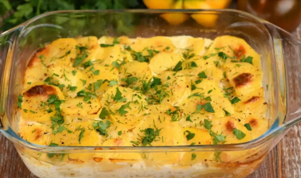6. Выливаем получившуюся смесь на картошку и помещаем форму в заранее разогретую до 200°C духовку. Запекаем около 30-35 минут — до тех пор, пока смесь не загустеет, а картошка не подрумянится. Аромат будет непередаваемым!