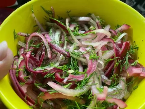 Приготовление: Лук нарезают полукольцами, добавляют мацони, лимонный сок, соль и перец. Тщательно перемешивают и оставляют на 30 минут. Эта версия придаст блюда легкость и свежесть.