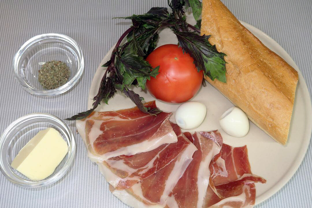 3. Смазать каждый ломтик багета сливочным маслом и посыпать сушёным базиликом. Далее на каждый кусок выложить слайс хамона, сверху — дольку помидора и колечко перепелиного яйца.