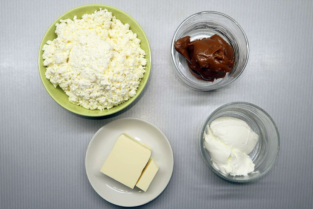 Первым делом нужно подготовить все компоненты. В глубокую чашу помещают творог, сливочное масло, сметану и варёную сгущёнку. С помощью погружного блендера следует тщательно перемешать ингредиенты до получения однородной и гладкой массы.