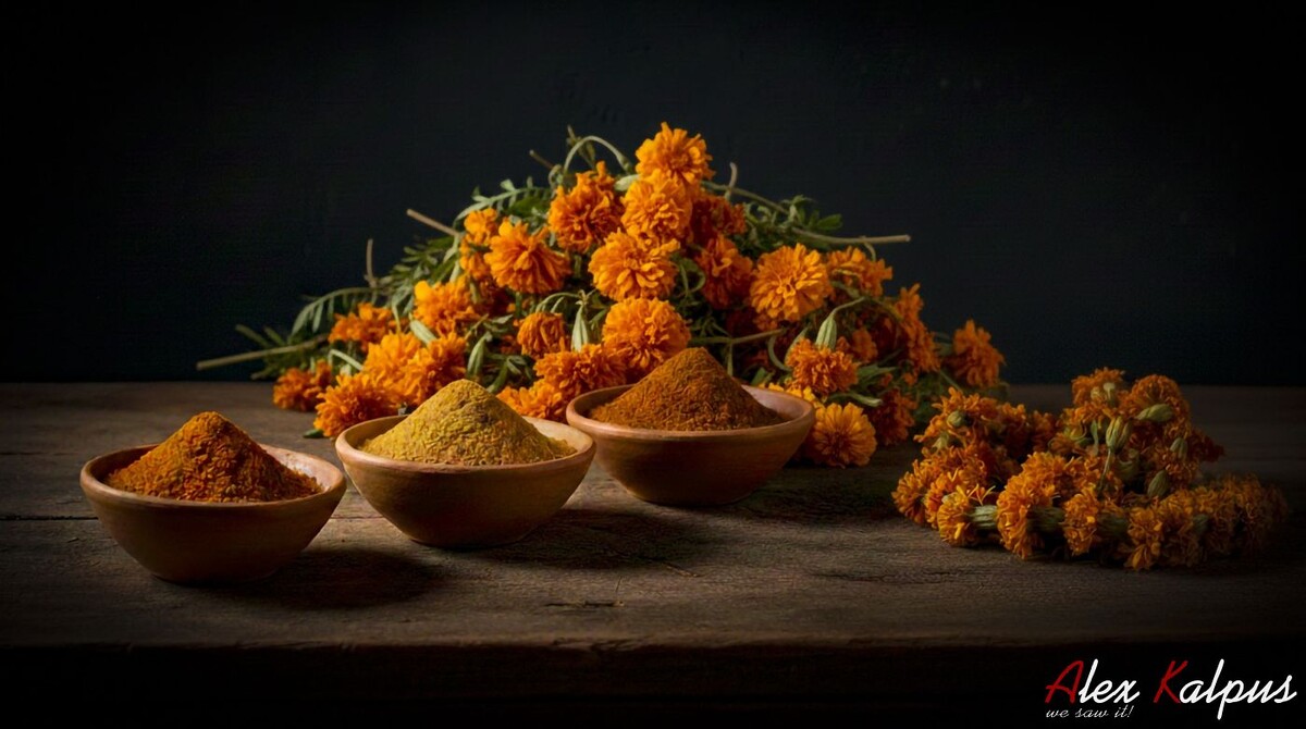 - Tagetes erecta (прямостоячие бархатцы) — содержат много каротиноидов, придающих насыщенный цвет.