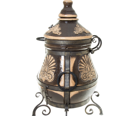 Этот уникальный тандыр привлекает внимание благодаря своему элегантному дизайну. Он может быть выполнен в глазури черного цвета или в нежном оттенке «слоновая кость». Эстетично оформленный корпус с золотым орнаментом и надежные ножки делают его не только стильным предметом интерьера, но и удобным в использовании.