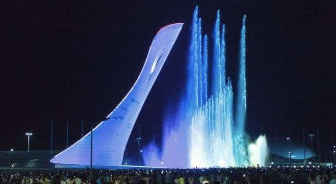 Самый высокий и примечательный фонтан находится в Олимпийском парке и называется Чаша олимпийского огня. Построенный к церемониям открытия и закрытия Зимних Олимпийских игр 2014 года, он представляет собой изображение Жар-птицы с бассейном диаметром 75 метров. Летние шоу шаманят водой на высоту до 70 метров под разнообразную музыку, меняя хореографию и оформление представления. Посетители могут удобно разместиться на лужайках, чтобы насладиться спектаклем.