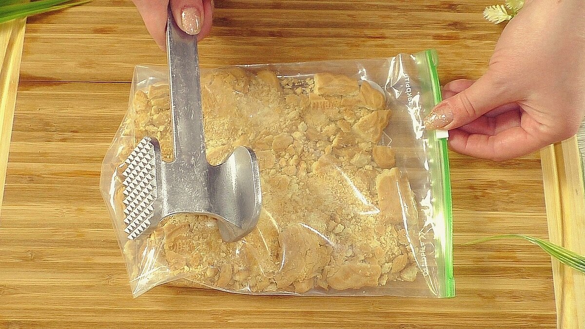 Сначала печенье нужно превратить в крошку. Это можно сделать при помощи блендера или, для тех, кто предпочитает традиционные методы, просто поместив печенье в пакет и размельчив скалкой или молотком для мяса, пишет Дзен-канал "Красилова Наталья / Food".