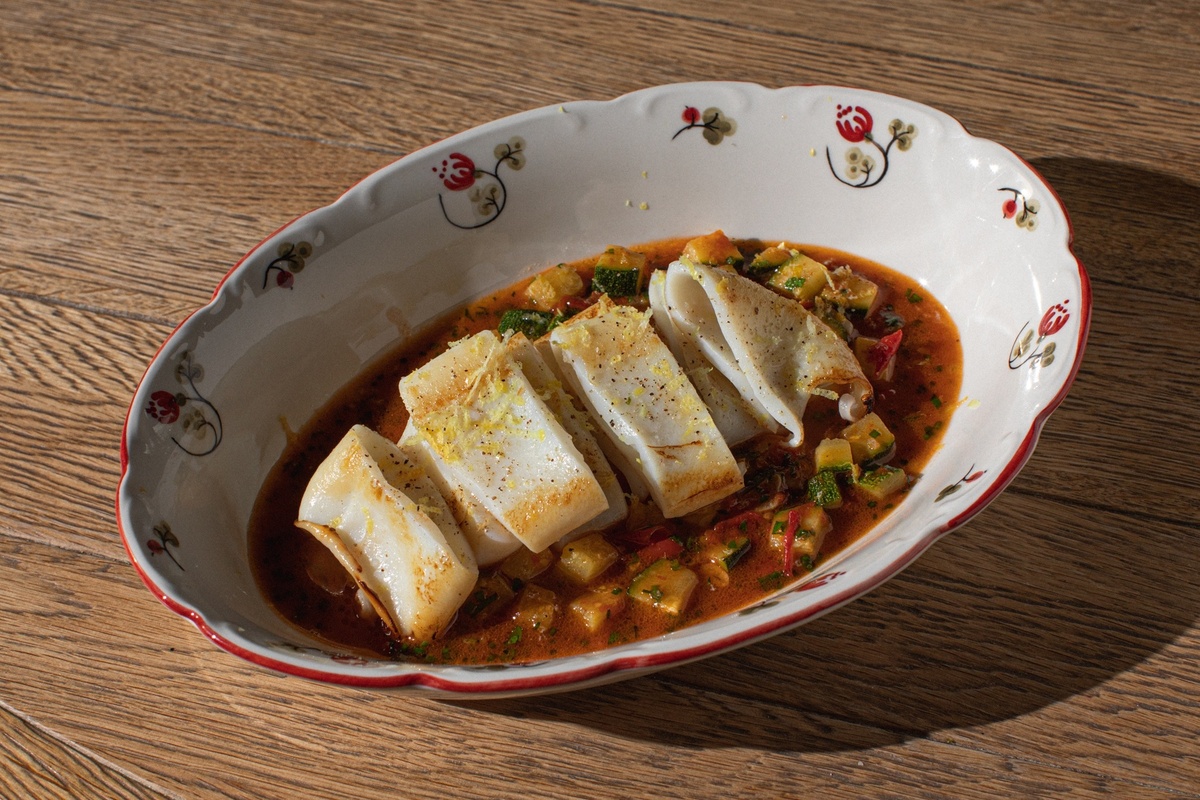 Рецепт прост: кальмара необходимо очистить от пленок и замариновать с солью, перцем и чесноком. На раскалённой сковороде обжарить кальмара по 30 секунд с каждой стороны. В этой же сковороде обжарить нарезанные помидоры и цуккини до золотистого цвета, затем добавить нарезанный чеснок и белое вино, позволяя алкоголю выпариться. Влить 100 мл куриного бульона и тушить до готовности овощей. В конце добавить сливочное масло, петрушку и немного лимонной цедры.