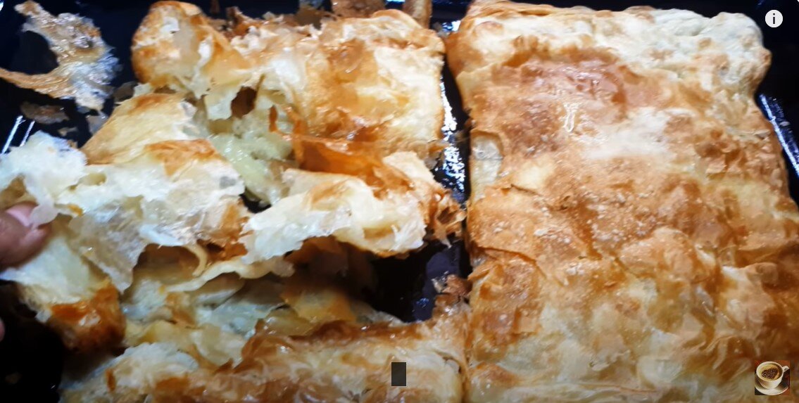 Тесто нужно аккуратно вытянуть на всю поверхность обеденного стола, размером, к примеру, 110 х 70 см. Слегка полив поверхность смесью растопленного сливочного и растительного масел в равных пропорциях, можно сформировать тонкий слой теста, напоминающий паутинку. Далее этот пласт складывается с четырех сторон и пополам, образуя слоеный корж, который затем переносится на противень без смазывания.
