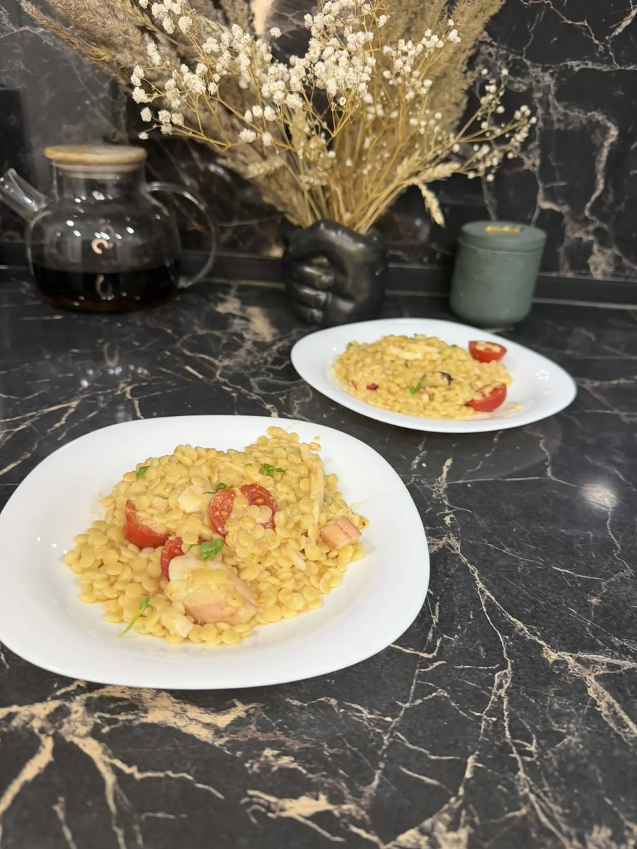 Верните отварной птитим в сковороду с морепродуктами и перемешайте до однородной массы.