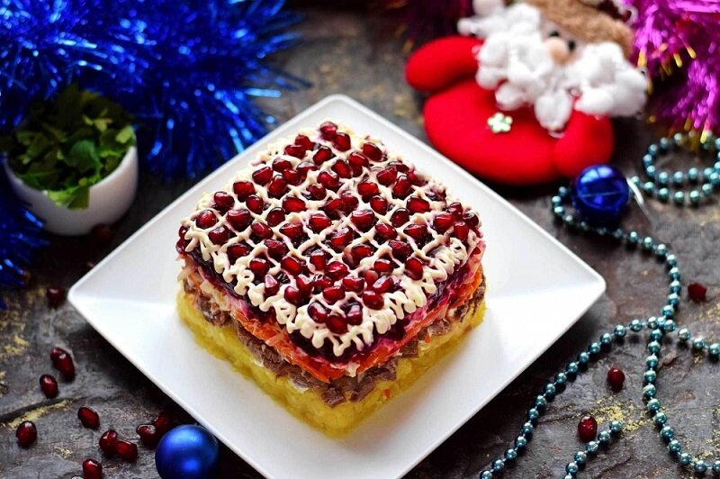 Этот яркий и аппетитный салат станет настоящей звездой любого новогоднего застолья, а также украсит любое другое торжество. Уникальное сочетание ингредиентов создает удивительную гамму вкусов, которая порадует даже самый искушенный вкус.