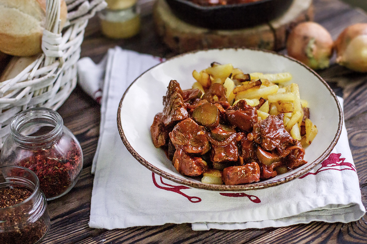Азу из говядины с золотистой картошкой и солёными огурчиками покоряет сердца кулинаров своим насыщенным вкусом и простотой в приготовлении. Многие шеф-повара выбирают для таких блюд томатную пасту вместо свежих помидоров. Все дело в уваривании компонентов, что придаёт пасте более концентрированный и яркий вкус, который идеально дополняет мясные деликатесы.