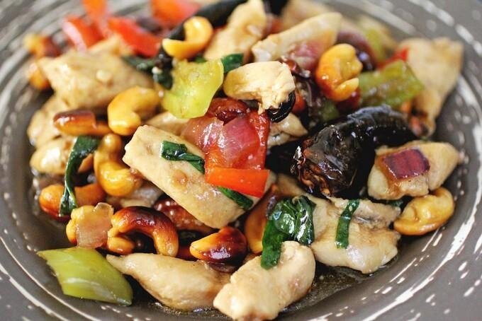 В том же масле обжарить измельченный чеснок в течение 1 минуты, а затем добавить курицу и репчатый лук. Жарить, помешивая, пока курица не сменит цвет. Влить пару столовых ложек воды и добавленные ранее соусы, тщательно перемешать. После этого добавить сладкий болгарский перец, а через минуту — кешью и зеленый лук. Хорошо перемешать и выключить огонь.