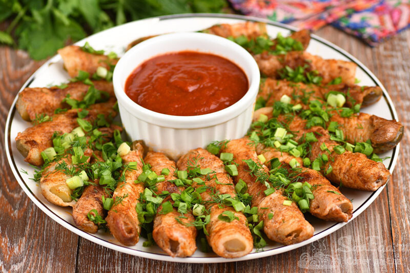Каждый огурец разрежьте на 4 дольки и оберните их беконом. Закладку можно скрепить зубочистками при жарке на плитe или в духовке. Обжаривайте на среднем огне 10 минут до золотистой корочки. Если готовите на мангале, делайте это без зубочисток, но в решетке. Подавайте с зеленью и соусом.
