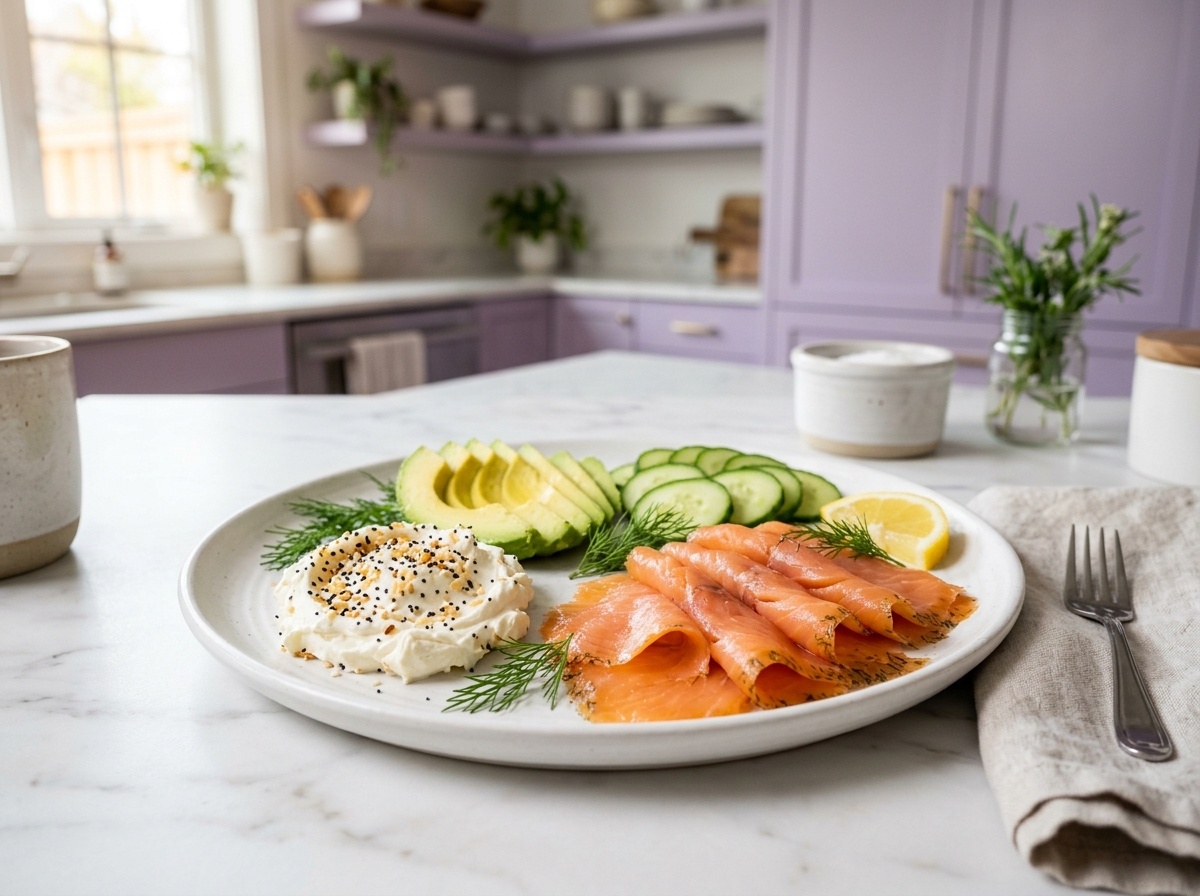 Иногда идеальный завтрак не требует кулинарных усилий. Просто уложите на тарелку качественные ингредиенты, и получится как вкусно, так и красиво. Предложенный вариант — это тарелка с копченым лососем, сливочным сыром с пряной посыпкой, ломтиками авокадо и свежим огурцом.