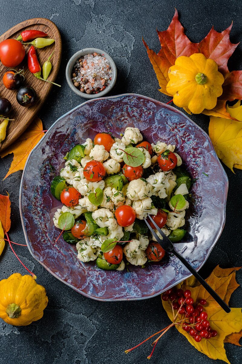 Удалите кончики огурцов и нарежьте их кольцами толщиной 1-1.5 см. Хорошо измельчите стебли базилика и добавьте их к огурцам.Разберите цветную капусту на мелкие соцветия, также можно нарезать немного кочерыжки. Чеснок нарежьте, не очищая, вместе с его шелухой. У укропа стебли также мелко нарезать и положить в салат. Помидоры черри просто нарезать, убрав плодоножки.Переложите овощи в полиэтиленовый пакет, добавьте соль и активно встряхивайте пакет, чтобы овощи выделяли сок. Это придаст салату особую пикантность, напоминая малосольные огурцы.Уберите пакет с салатом в холодильник на пару часов, чтобы состав настоялся.Когда время пройдет, выложите салат на тарелку и наслаждайтесь натуральным вкусом и здоровыми витаминами. Этот салат оставит вас в восторге и заново откроет для вас цветную капусту!