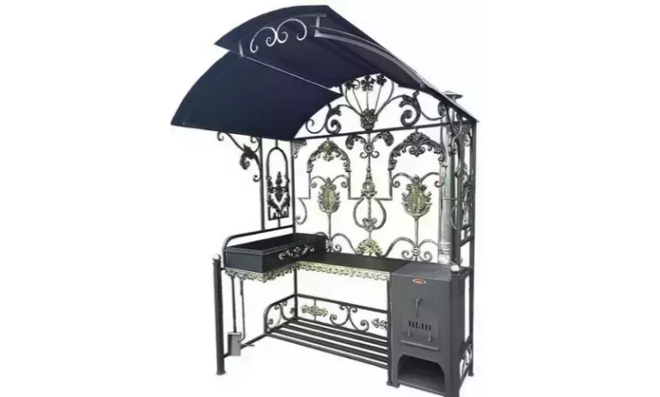 Жаровня и печь находятся напротив друг друга, а между ними удобно расположился столик для нарезки мяса, с нижней полкой для хранения дров или посуды. Крыша защищает от солнечных лучей и дождя, а кованые элементы дизайна подчеркивают восточную тематику с эффектной позолотой.