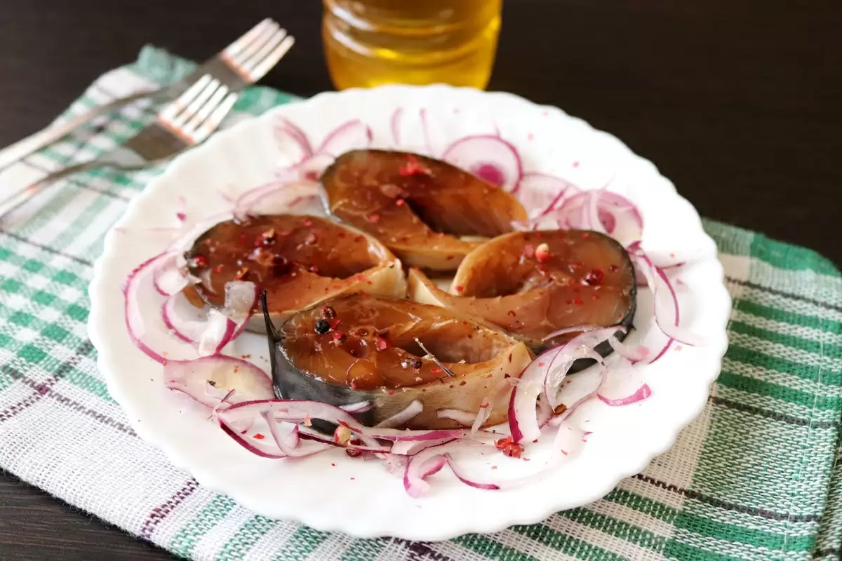 Маринованная скумбрия с луком — это отличный вариант закуски для выездов на природу. Пока шашлык жарится, кусочек рыбы с черным хлебом станет настоящим гастрономическим удовольствием!