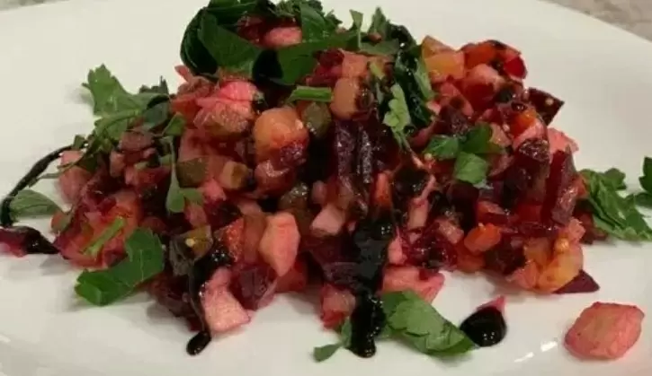 Процесс приготовления следует начинать с варки свёклы и картофеля, затем смешать все ингредиенты, включая нарезанные грибы и яблоки, с добавлением заправки. Придайте салату необходимый вкус с помощью специй и подавайте красиво оформленным.