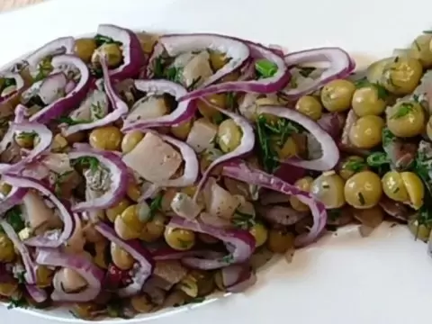1. Начать следует с нарезания филе сельди на средние кубики и выкладывания их в большую тарелку. После этого добавьте к рыбе зелёный горошек.