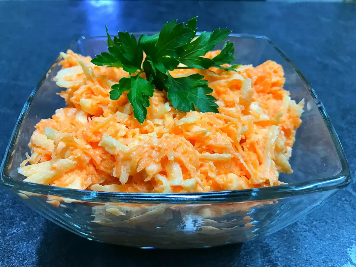 В глубокой миске смешиваются натертые морковь и яблоко. А теперь главный секрет – добавляем одну чайную ложку простого столового хрена. Сочетание этих компонентов откроет новые грани вкуса, о которых вы и не догадывались.