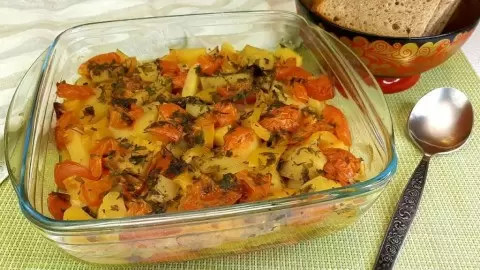 К овощной подушке укладываются кусочки курицы, которые необходимо слегка приправить. Картофель следует нарезать брусочками и равномерно распределить поверх курицы. Добавьте нарезанный сладкий перец и дольки помидоров. Немного посолите и добавьте зелень. Затем накройте форму фольгой и отправьте в предварительно разогретую духовку — запекать в течение 40-50 минут. После этого уберите фольгу и дайте блюду подрумяниться ещё 20 минут. Важно следить за готовностью: картофель и куриное мясо должны стать мягкими.
