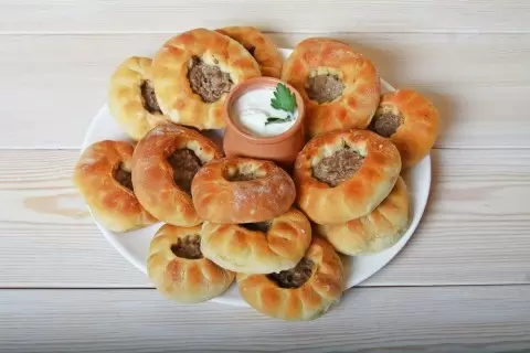- Раскатайте тесто в жгут и поделите на равные кусочки. Каждый кусочек раскатайте в лепешку, положите на нее 1-2 столовые ложки фарша и защипните края, оставив отверстие в центре.