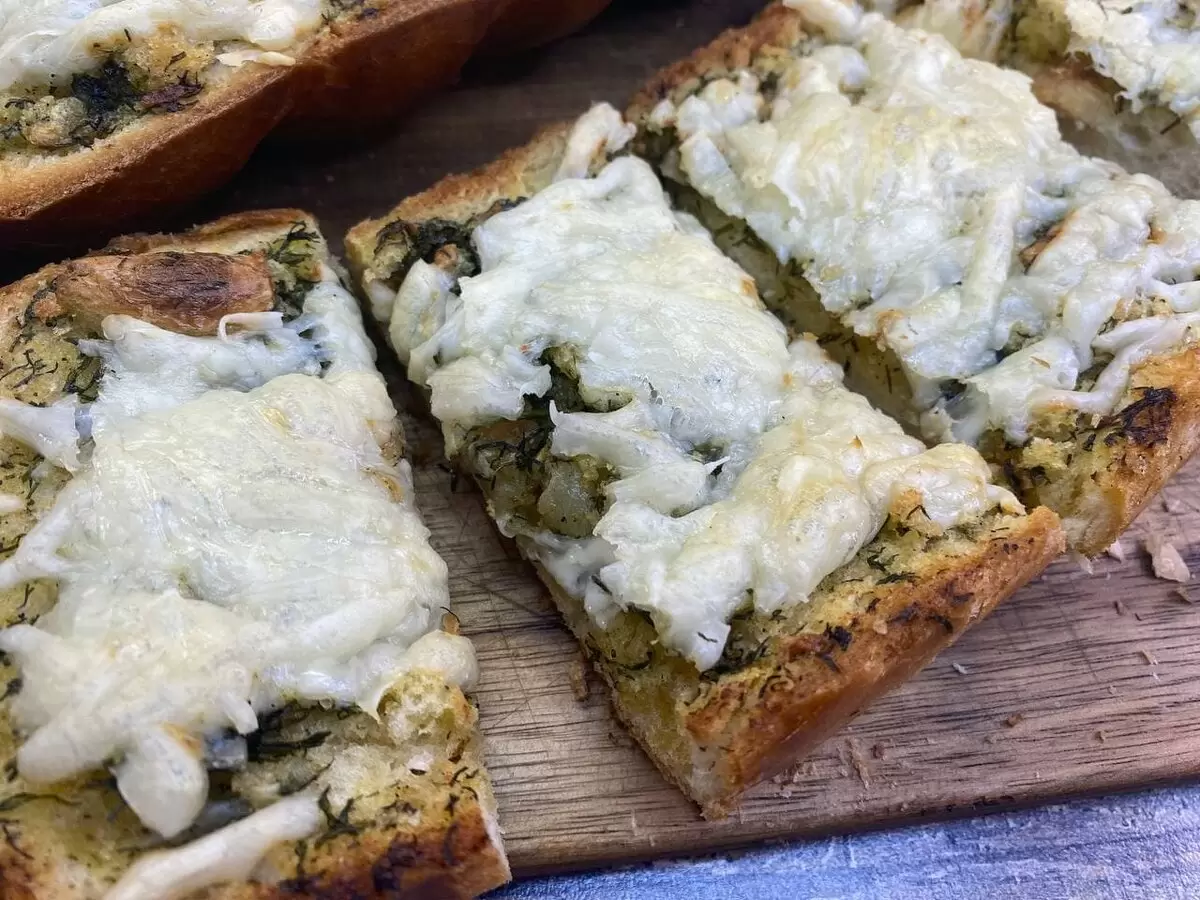 6. Поместите батон в заранее разогретую духовку на 5-8 минут, пока сыр не расплавится и не подрумянится.