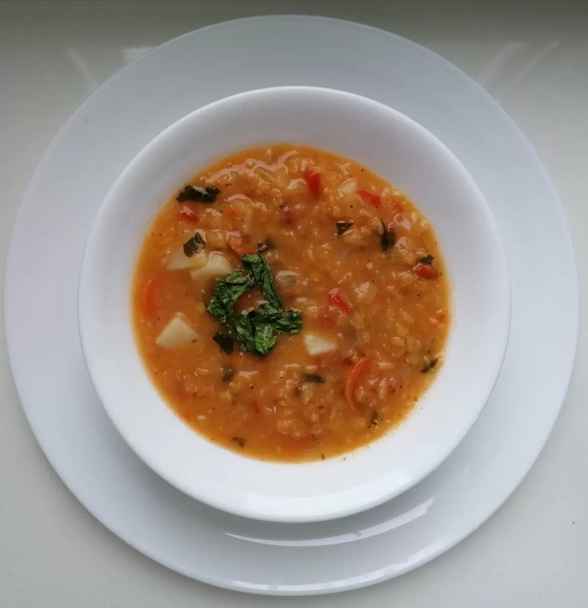 Приготовление не займет много времени, всего 40 минут. Процесс начинается с подготовки овощей: картофель нарезается кубиками и помещается в холодную подсоленную воду. После добавляют порезанный сельдерей и кругляшки моркови. Лук слегка обжаривается на сковороде с оливковым маслом, после чего все ингридиенты объединяются в кастрюле. Чечевицу предварительно промывают, добавляют в кипящую воду вместе с томатной пастой и овощами, а затем варят до готовности. В финале в суп вводят обжаренные зелени с пряностями, придавая блюду особый аромат. Этот суп станет настоящим украшением любого стола и порадует своей питательностью и вкусом!