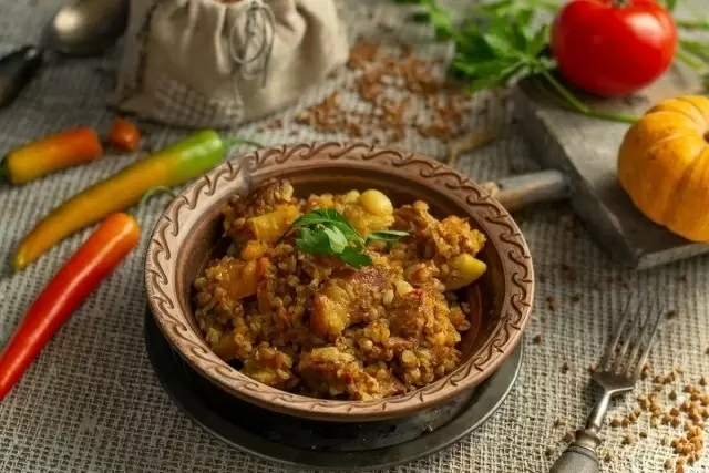 5. Промойте гречневую крупу под холодной водой и добавьте ее в жаровню. Затем выложите нарезанную тыкву, залейте мясным бульоном и добавьте соль по вкусу.