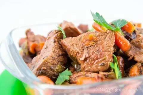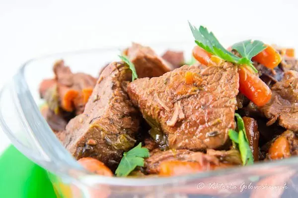 Это удачное сочетание ингредиентов в сочетании с длительным томлением на низкой температуре придает блюду уникальный вкус, который подкупает с первой ложки. Подавать горячим, но и холодное мясо будет не менее восхитительным!