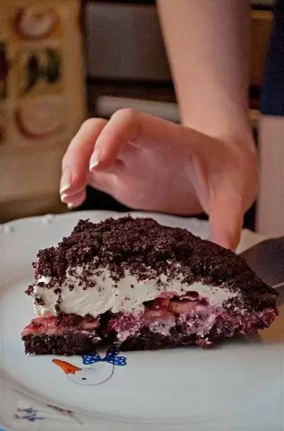Начинается всё с приготовления начинки. Бананы нужно нарезать вдоль или кружочками и уложить на дно формы. Затем следуют вишни (если они замороженные, следует предварительно отжать излишки жидкости). Сливки взбиваются с ванильным сахаром и желатином, после чего выкладываются сверху на фрукты, прикрываясь шоколадной крошкой.Поместить торт в холодильник минимум на час для того, чтобы он охладился.Теперь следует заняться тестом. Смешать размягченное масло с сахаром до однородности, добавляя желтки по одному. В отдельной емкости взобрать белки до крутой пены. Затем просеять муку, какао, тертый шоколад, орехи и разрыхлитель. Постепенно добавить эту смесь в масляную массу, чередуя с взбитыми белками. Форму для выпекания смазать маслом и посыпать мукой, выложить тесто и выпекать 30 минут при 180 градусах. Готовность проверить зубочисткой, после чего оставить торт остывать на решетке.