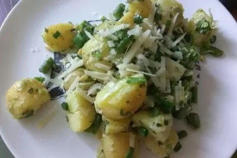 3. Смешать охлажденный картофель с фасолью и приготовленным песто. Добавить уксус по вкусу, нарезанный зеленый лук и кедровые орешки. При необходимости досолить и поперчить. В завершение посыпать стружкой пармезана для дополнения вкуса и подавать сразу же к столу.